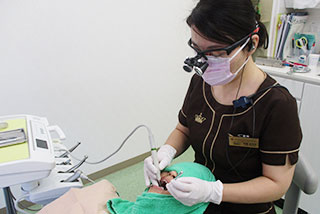 治療中は、ゴーグル・マスク・ルーペ・グローブを使用